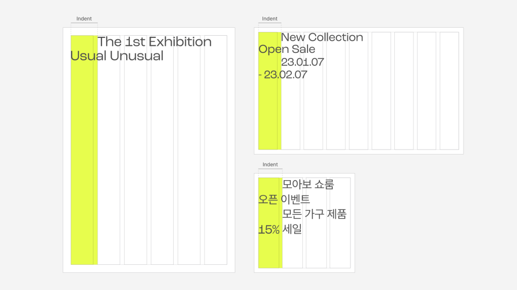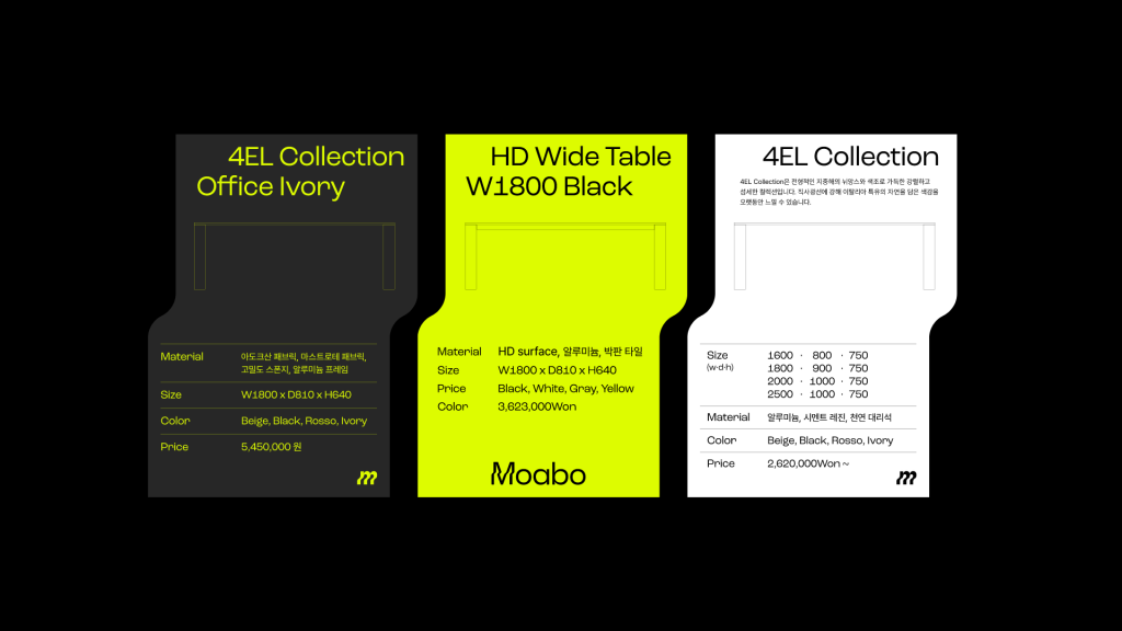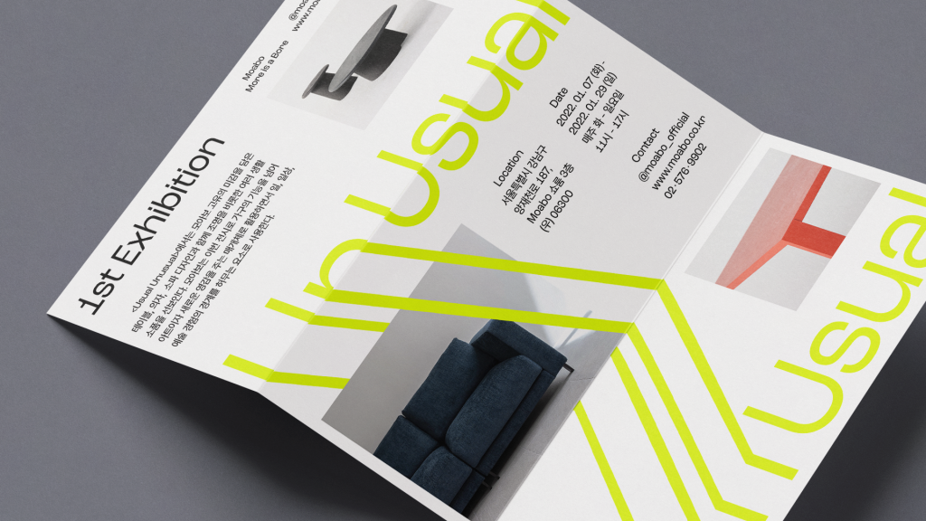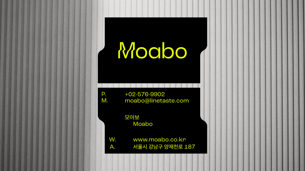 매뉴얼 그래픽스는 이러한 모아보의 태도를 ‘Usual Unusual이라는 콘셉트로 시각화했습니다. 베이직한 알파벳의 일부가 늘어나며 새로운 형태로 확장되는 그래픽 시스템은 작은 변화가 만들어내는 가능성과 차별성을 상징합니다. 여기에 네온옐로우 컬러와 위트 있는 그래픽 플레이를 더해 신규 브랜드로서 강렬한 첫인상을 구축하고자 했습니다.